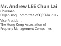Mr. Andrew Lee Chun Lai, currently the Managing Director of Sunbase International Properties Management Ltd., is the Vice President of The Hong Kong Association of Property Management Companies for the Year of 2011-2013. He was awarded by the University of HK the Diploma in Housing Management and obtained the Diploma in Surveying and Bachelor of Science (Honours) Degree in Facilities Management awarded by college and university respectively in UK. After had been serving in the Government for over 10 years, he joined the private sector and worked in the subsidiary company of Cheung Kong Holdings, First Pacific Davies and was the Director of the joint venture between FPD & Bermuda Trust (HK) Limited before joining the present company. His professional qualifications include the Corporate Member of Chartered Institute of Housing UK (MCIH); Hong Kong Institute of Housing (MHKIH); Hong Kong Institute of Surveyors (MHKIS); and the fellow member of the Royal Institution of Chartered Surveyors (FRICS). He is also a Registered Professional Surveyor (RPS) and Registered Professional Housing Manager (RPHM). Mr. Lee has been serving on various public bodies and institutions, such as the Panel Member of Disciplinary Tribunal Panel - Electrical & Mechanical Services Department; Board Member - Security Services Training Board of Vocational Training Council; Senior Consultant of Shenzhen Property Management Association; Chairman of Residential Professional Group Committee of RICS HK Board; former President of Hong Kong Institute of Housing; and former Chairman of Registration Committee of Housing Managers Registration Board. |